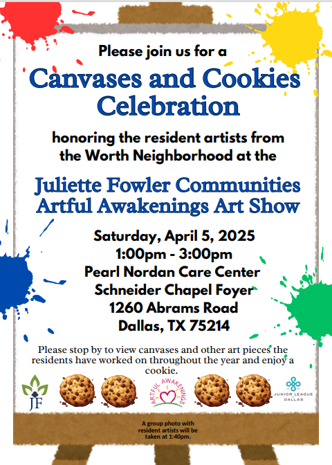 Mark your calendars! This special art show showcases the creativity of our Worth Neighborhood residents living with dementia, who have participated in Artful Awakenings—a therapeutic art program led by amazing Junior League of Dallas volunteers. More than just painting, this program fosters self-expression, storytelling, and the joy of connection. Let’s come together to honor their work and the volunteers who make it possible.